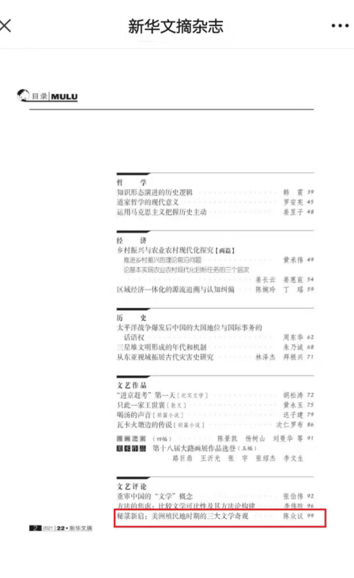 触冬暖阳万物藏,岁月沉香悦时光。《yl6776永利集团学报(人文社会科学版)》再传喜讯!2021年第3期刊发的由本刊特约编审孙绍先教授组稿编辑的《秘箓新启:美洲殖民地时期的三大文学奇观》一文,被《新华文摘》2021年第22期“文艺评论”栏目全文转载。